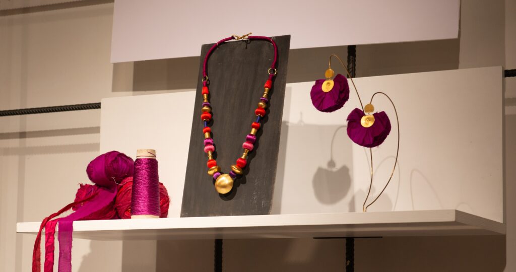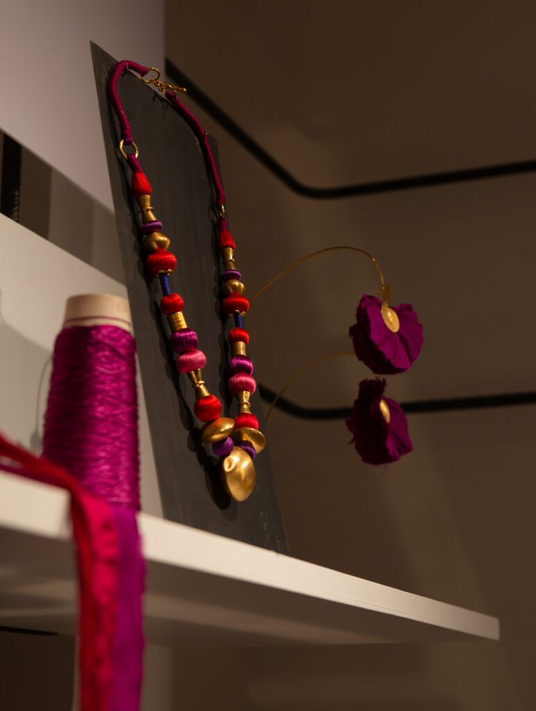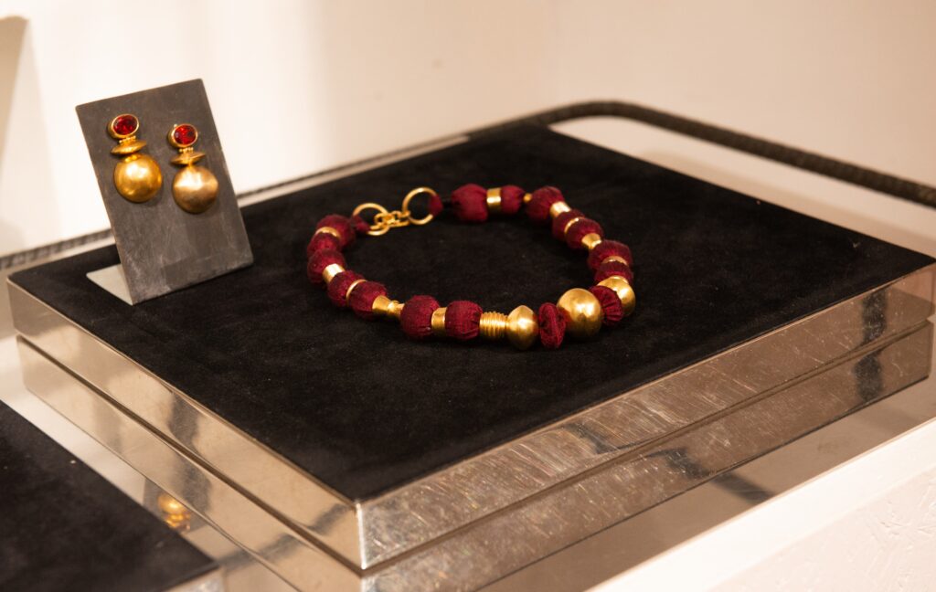 Les invités ont découvert une série de boucles d’oreilles-sculptures, bracelets statement, colliers ornés de fils de soie et broches délicates : autant d’interventions sculpturales qui dessinent la silhouette et lui apportent rythme et caractère.