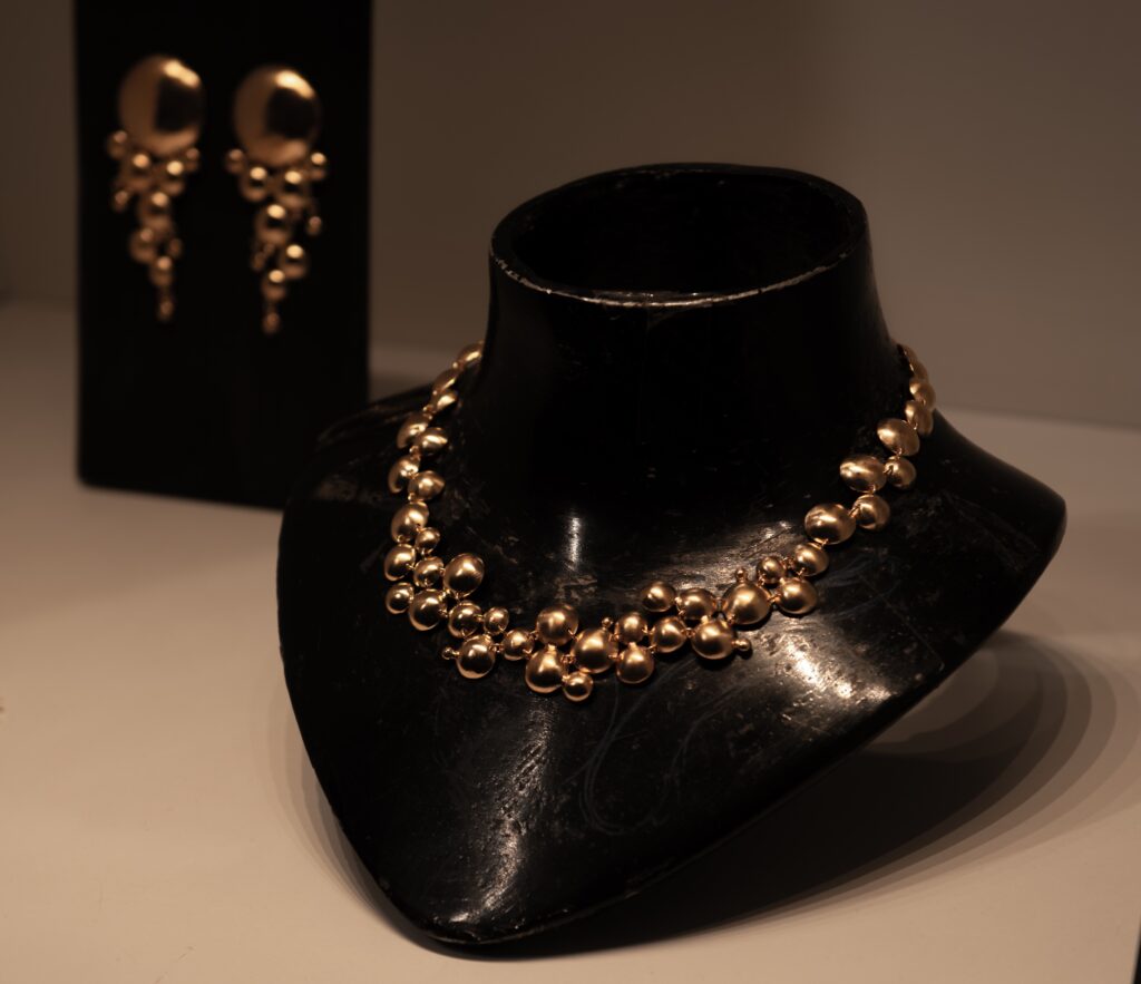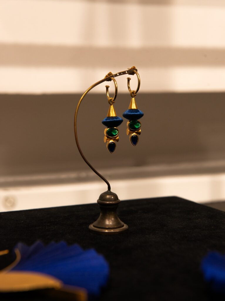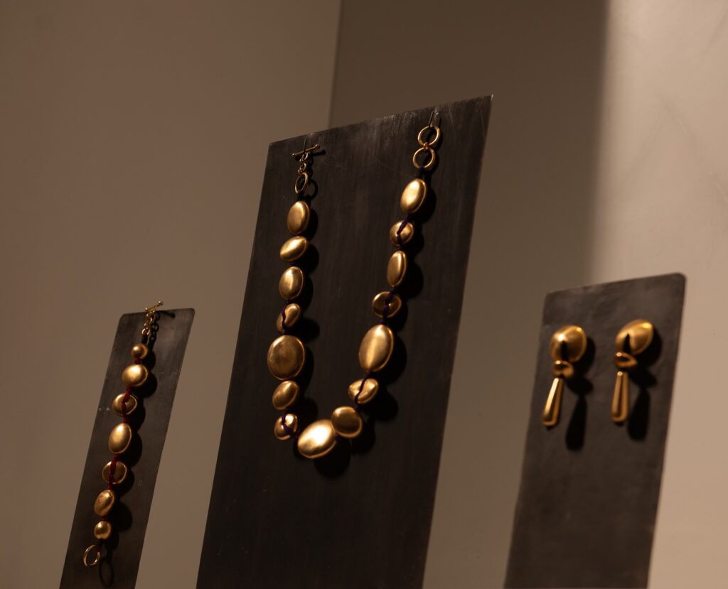 Les bijoux étaient présentés sur des socles sur mesure au design sobre, mettant en valeur la précision des lignes et le savoir-faire de l’atelier de La Canée.